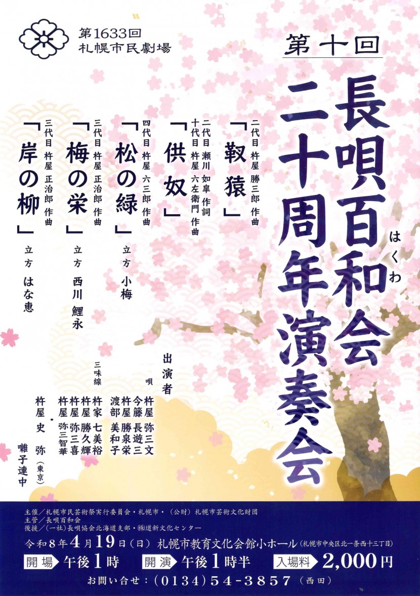 札幌市民劇場前のページ1次のページ2026年3月15日(日)第1629回公演プロウインドオーケストラ北海道 春の吹奏楽コンサート2026開場13:30/開演14:30札幌市教育文化会館 大ホール2026年3月27日(金)第1631回公演第66回子ども舞踊祭開場17:30/開演18:00札幌市教育文化会館 大ホール2026年3月28日(土)第1632回公演コーロ・ファーチレconcert2026 ヨハネ受難曲開場12:30/開演13:00札幌コンサートホールKitara 小ホール2026年4月19日(日)第1633回公演第10回長唄百和会20周年演奏会開場13:00/開演13:30札幌市教育文化会館 小ホール2026年5月5日(火)第1634回公演三澤眞由美先生ご勇退記念コンサート「つなぐ」開場14:15/開演15:00札幌文化芸術劇場 hitaru札幌市民芸術祭過去実施公演